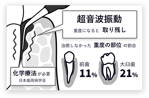 重度になると口腔内細胞が存在する歯石の取り残しが増え、治療が難しくなります。取り残した部分には、抗菌薬の投与といった副作用を伴う科学療法が必要になります。